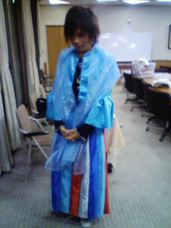 上下とも生地はサテンでキラキラしています。裳の色合い(青、赤、水色、灰色)は生地の反射するせいで灰色が白に見えてしまい、図らずももトリコロールに見えてしまっていたのは秘密です。