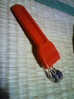車輪みたいな凹凸のある部分をころがすことで、チャコペーパーのチャコを布地に写し取るというわけです。