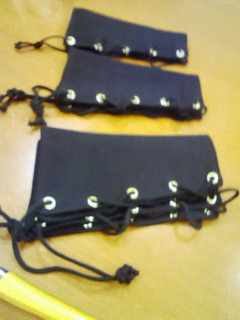 黒い布を切って、2枚を張り合わせて縫い、ハトメを使って紐を通す穴を開けていきます。