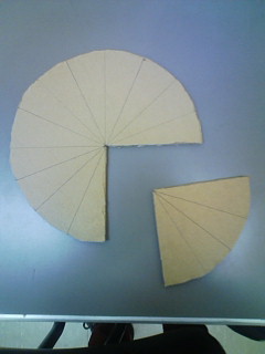 厚紙で型を作り、その上に割り箸を芯材として入れ、紙粘土をその上に平らにのばし、型からはみ出た粘土を取り除いて、成型。