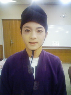 普段着の着物に手甲や足袋を付け、草鞋を履いて刀を下げています(ただし病弱で重いものが持てないので刀は小さいです)。烏帽子をつけているのは元服した証拠=大人の証になります。