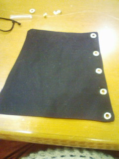 黒い布を切って、2枚を張り合わせて縫い、ハトメを使って紐を通す穴を開けていきます。